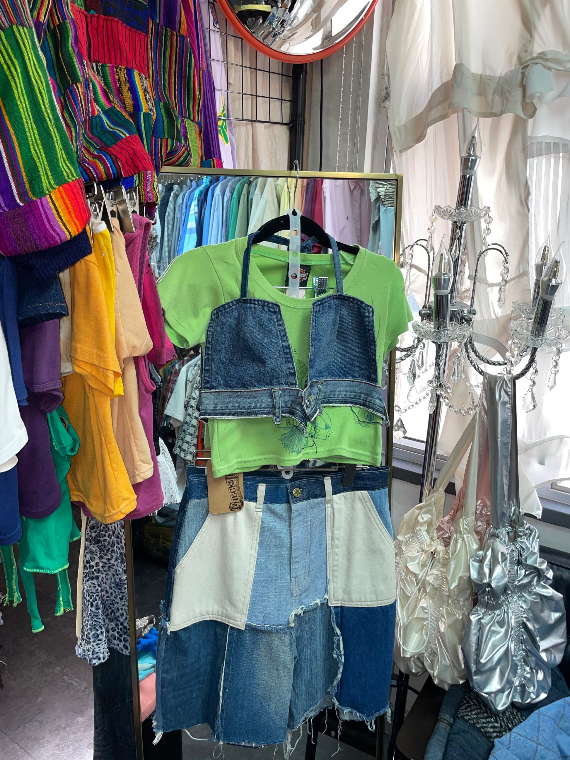 Remake jorts 30” + Harley remake top + denim remake bra top